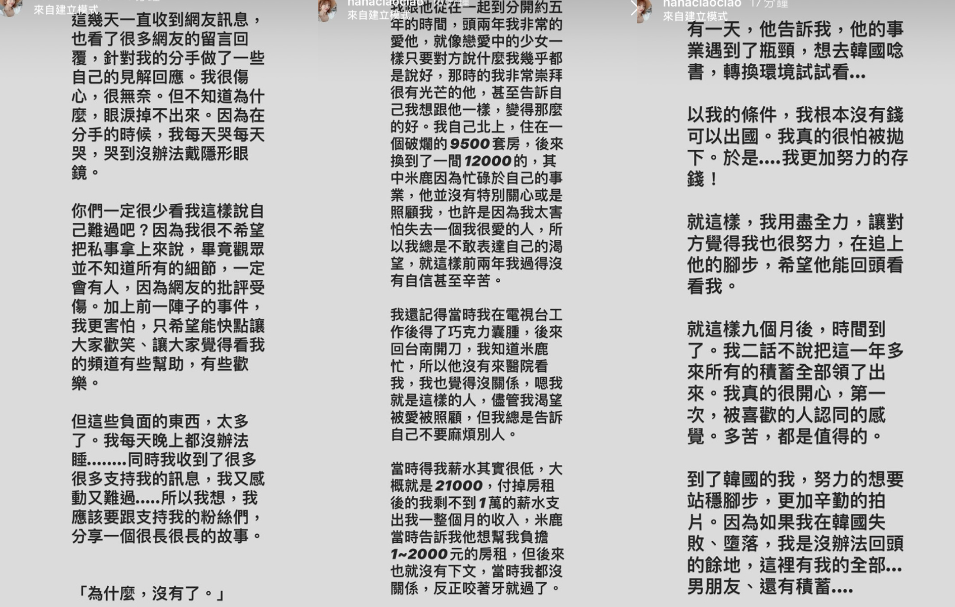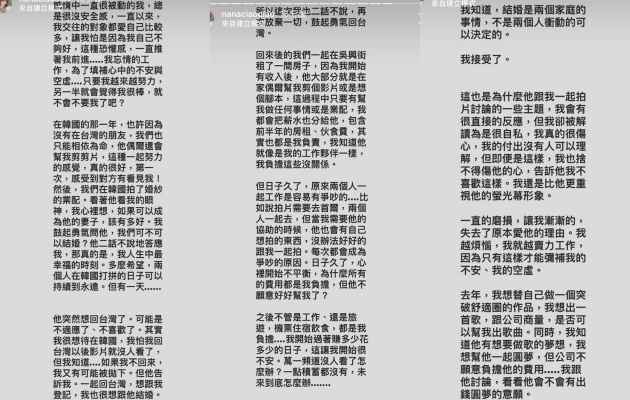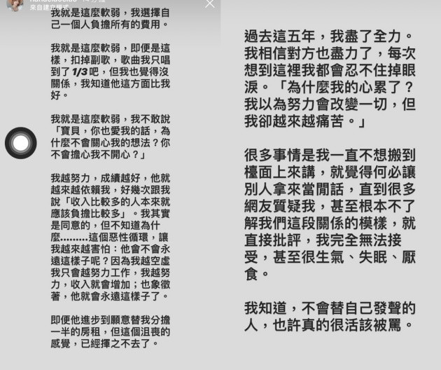 阿圓自分手消息傳出後,不斷飽受網友批評,認為提分手的人就是不對,而對此阿圓也有千言萬語想說,最終她決定將這段感情故事,全寫出來和大家分享。阿圓在限時動態中提到,交往前兩年她就如戀愛中的少女一般,非常崇拜米路的光芒,因此自己北上,住著破爛套房,即便對方因為忙碌沒有特別照顧他,但她也不敢表達,就這樣沒有自信且辛苦了兩年。