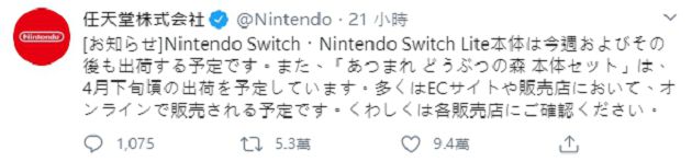 另外,Switch遊戲《集合啦!動物森友會》自上市以來熱銷全球,週邊商品也是人氣不斷,在Switch主機恢復出貨的同時,動森版限量主機也將於4月下旬出貨,讓事先預購的玩家們終於能盼來等候多時的遊戲機!遊戲主機恢復出貨後,在市面上瘋狂飆升的價錢也盼能獲得趨緩,消息曝光後讓不少網友們鬆了一口氣。