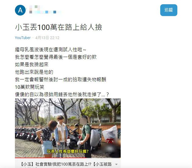 網紅「小玉」在Youtube上擁有148萬的訂閱數,以大膽無厘頭的風格吸引一票死忠粉絲支持,頻道主題多以大尺度的實測與開箱影片為主,但也因此飽受不少爭議,每每出片都會造成話題。日前,小玉進行社會實測,將100萬現鈔放在路邊觀察路人的反應,不料這舉動與路人的反應卻受到Dcard網友熱議,質疑「是set好的吧?」。