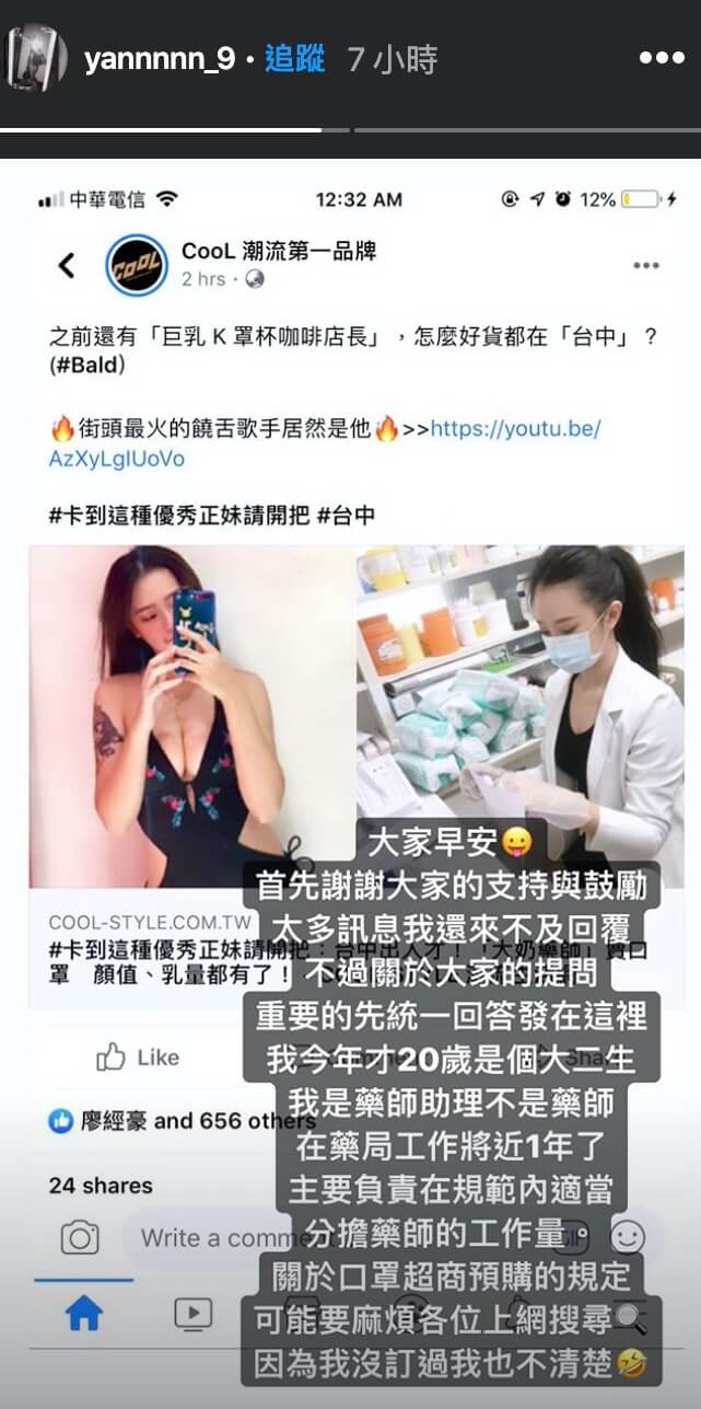 後來有網友找到了這位藥師助理的IG,讓她在一夕之間爆紅,私訊小盒子也突然被灌爆,讓她驚訝地在限時動態中發文寫下,「謝謝大家的支持與鼓勵,大家的提問我統一回答,我今年20歲是大二生,而且我是藥師助理不是藥師,在藥局工作將近一年,主要負責在規範內適當分擔藥師的工作量~」並跟網友們告知,「口罩超商預購規定」大家要自己上網搜尋,我沒訂過我也不清楚哦!