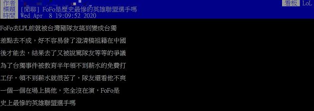日前,有網友在PTT上問卦「FOFO是歷史最慘的英雄聯盟選手嗎?」,表示FOFO在去中國發展前夕因台灣隊友爆料緣故,導致他政治立場尷尬不已,在發表聲明澄清「祖籍在中國」後負評才逐漸平息,不料又與前女友葉久馨爆出「感情糾紛」,同時兩人的對話紀錄誤觸「出國」、「大陸狗」等敏感用語,被BLG戰隊進行六個月薪資的扣罰。近來,隊友更疑似對FOFO懷抱著敵意,「一個一個在場上搞他,完全沒在演」,無薪出賽加上隊友敵意,讓FOFO的近期的職業生涯可說是慘淡不已。