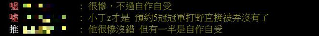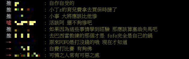 貼文一出引起網友熱烈議論,紛紛留言直呼「很慘,不過自作自受」、「他很慘沒錯,但有一半是自作自受」、「活該,要交那種必取」、「可憐之人常有可惡之處」、「如果因為這些事情學到經驗,那應該算塞翁失馬吧」、「自費打比賽,有夠佛」。但也有不少粉絲替FOFO抱不平,表示「Fo哥從頭到尾都是最無辜的那個,替他感到不值」、「中國人只會欺負FoFo,真替他感到不捨」。
