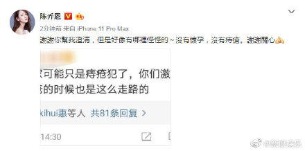 不過澄清過後還有個相當搞笑的插曲,當時陳喬恩走路姿勢被指懷孕之後,卻有網友對此神解讀:「人家可能只是痔瘡犯了,你們激動個啥,我痔瘡的時候也是這麼走路的。」因此釣出本尊特別截圖回應:「謝謝你幫我澄清,但是好像有哪裡怪怪的~沒有懷孕,沒有痔瘡,謝謝關心。」笑翻一大票網友。