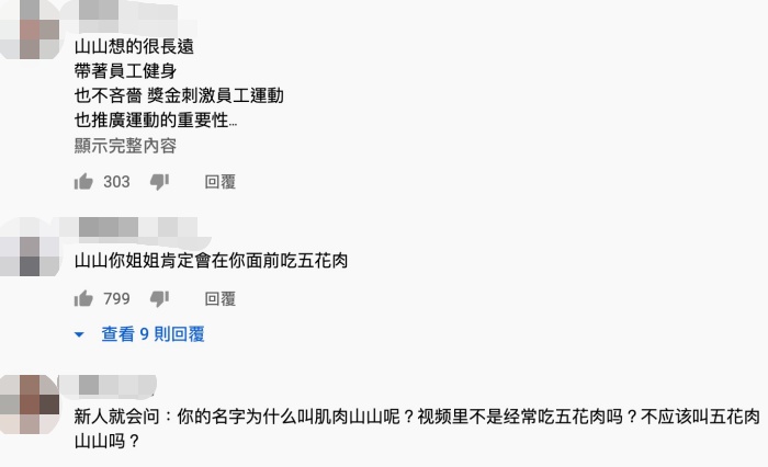 肌肉山山影片一出,立刻吸引不少粉絲觀看,同時也有人敲碗姊姊「松松」快趁山山健身時,在一旁吃五花肉惡整他!另外也有粉絲留言表示,「哈嘍大家好我是來自韓國的肥肉山山」、「有沒有考慮改成『肥肉山山』這樣就不用減肥了」、「不是變胖,是五花肉跑到肚子裡」、「PD可以準備五花肉吃播企劃了!」、「刺激你一下肥肉山山,這樣你才更有動力健身」。
