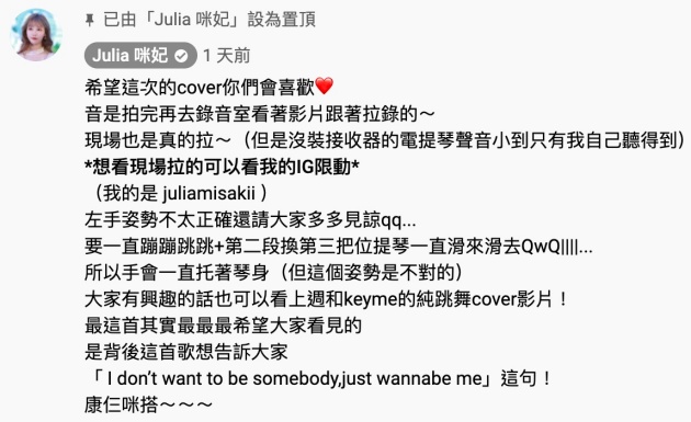 雖然有網友懷疑,不過有更多粉絲現身紛紛力挺支持,「跳舞已經很不容易了!還拉小提琴~超厲害ㄉ」、「拉小提琴跳舞真的太厲害了」、「小咪的頻道越來越有自己的風格了」、「看到咪妃每次都不斷地在精進跟突破自我,真的很讚歎跟感動,咪妃真的好棒」、「這次的cover也好看啊!」、「真的有驚豔到」、「拉著小提琴跳舞真的好帥啊」。