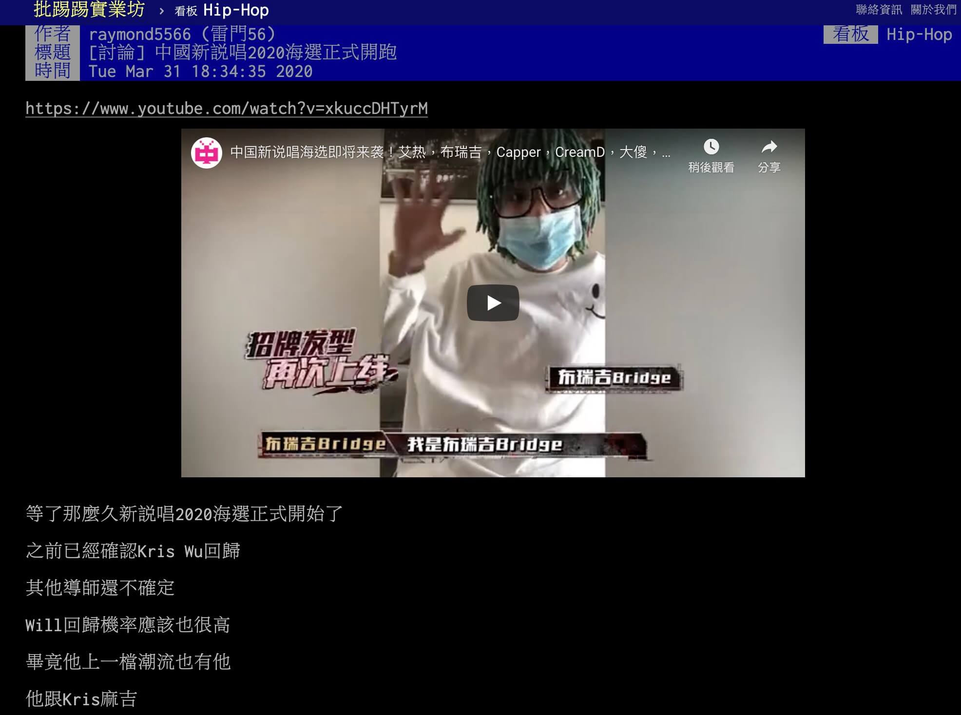 連播三年的選秀節目《中國有嘻哈》在2018年時改名為《中國新說唱》,每當節目開播後都掀起一陣嘻哈文化的熱潮,也將華語嘻哈推廣至全世界,然而每年節目皆選在暑假時開播,今年雖然碰上新冠肺炎的疫情關係,尚未明定播出時間,但日前官方也宣布開始進行海選,許多選手也都在宣傳影片中曝光,然而在PTT嘻哈版中就出現一則導師的討論串,更有鄉民直呼:「熱狗被封殺了」,引發熱議。