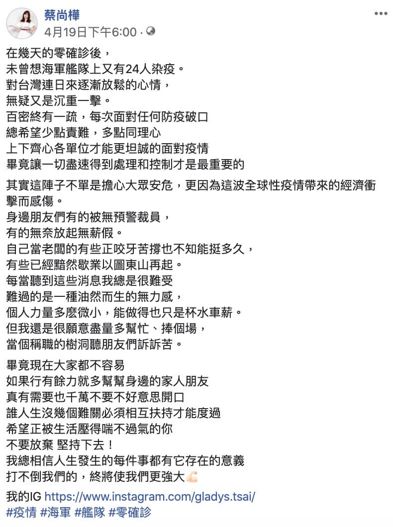 先前台灣好幾天都傳出「零確診」之後,本以為疫情已經逐漸穩定下來,沒想到竟無預警爆發出海軍艦隊有24人感染確診,讓主播蔡尚樺非常擔心的在臉書發文寫道,「在幾天的零確診後,未曾想海軍艦隊上又有24人染疫!對台灣連日來逐漸放鬆的心情,無疑又是沉重一擊」。