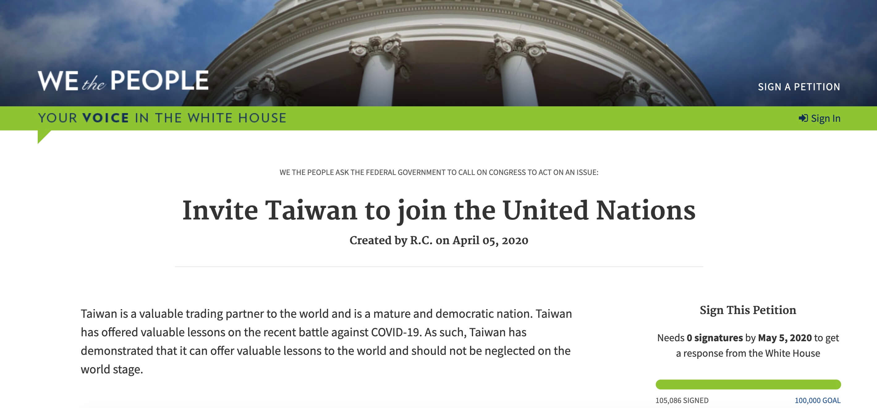 美國白宮網站「WE the PEOPLE」在本月5日突然有一位名為「R.C.」的網友發起了連署,希望可以「邀請台灣加入聯合國」,這份連署本來是預訂目標在5月5日達到10萬份連署,沒想到在本月21日就已經達標,而且還多了5000多份,讓白宮必須在請願活動設立起的60天內,在6月5日前回覆這個請願!讓熱愛中國的藝人黃安氣到在微博發文痛批,「不准!」