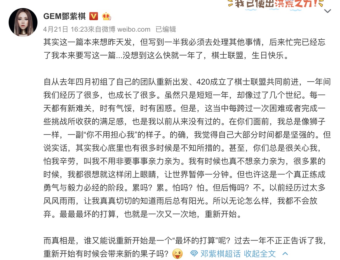 然而在昨日鄧紫棋又再度更新了貼文,適逢後援會「棋士聯盟」1週年,她也寫下長文吐露解約後的心聲:「雖然只是短短一年,卻像過了幾個世紀。每一天都有新難關,時有氣餒,時有困惑」,接著她也表示在粉絲們面前時,自己就像是獅子,大部分的時間都是很堅強的形象,但很多時候也會感到很不知所措,但她在面對這一切挑戰時並不害怕也不後悔,文末也堅強的說道:「誰又能說重新開始是一個『最壞的打算』呢?過去一年不真正告訴了我,重新開始有時候會帶來新的果子嗎?」。