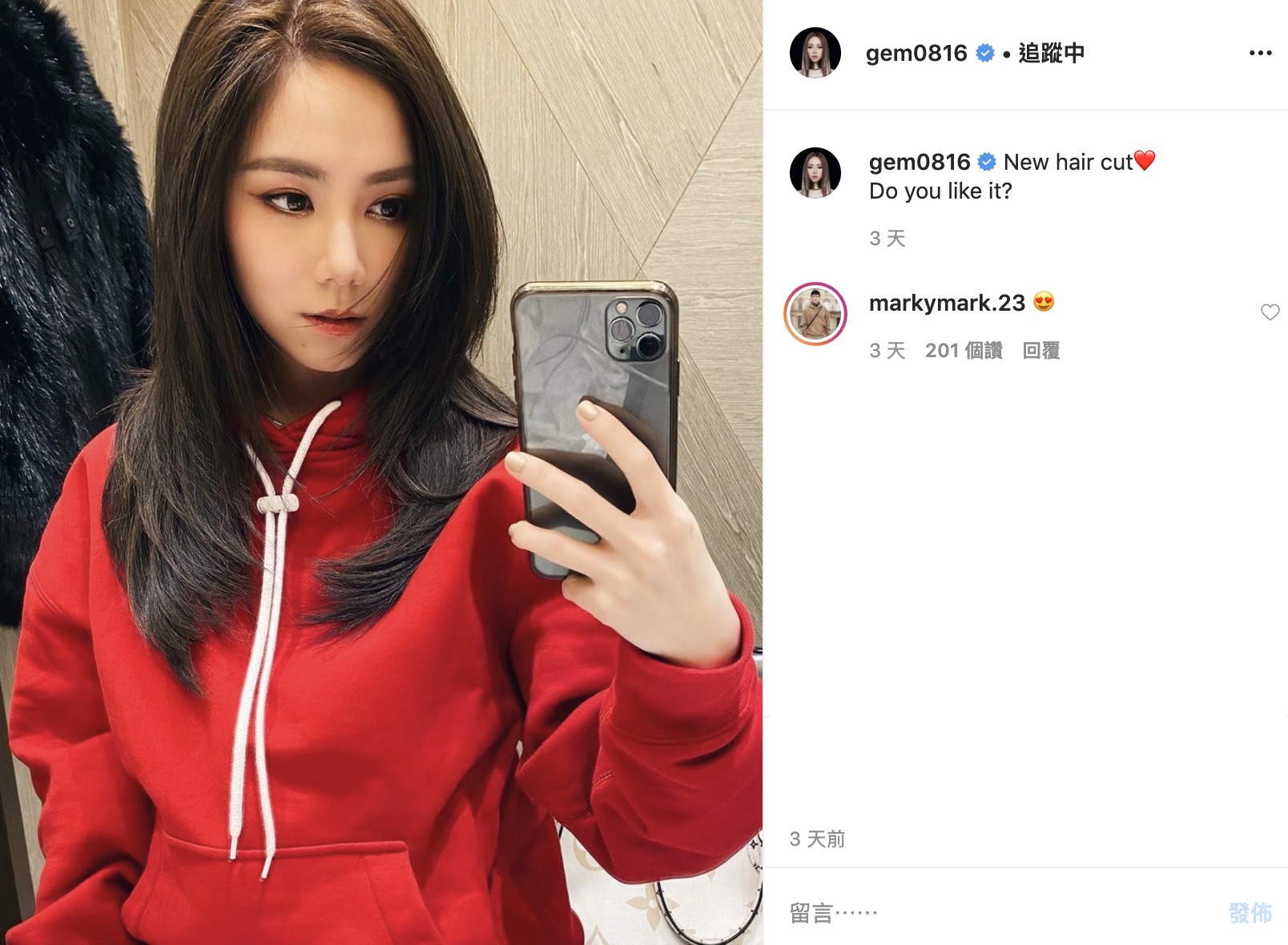 日前鄧紫棋在社群平台上曬出一張自拍照,畫面中鄧紫棋身穿一件大紅色的帽T,映襯出她白皙的皮膚,而鄧紫棋的髮長原先大約是在胸部的區域,而這次她將頭髮剪至胸上的長度,看上去更加俐落,鄧紫棋也發文寫下:「New hair cut Do you like it?」,粉絲們看見後也紛紛大讚新髮型,對此造型師男友Mark也回應了雙眼冒愛心的表情符號,低調放閃的互動也讓許多粉絲感到相當甜蜜。