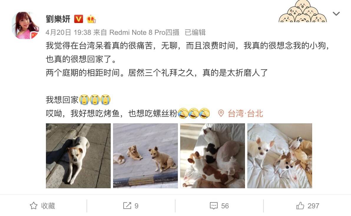 劉樂妍最近在微博發文貼出愛犬們的照片,並在貼文內容中寫道,「我覺得在台灣待著真的很痛苦、無聊,而且又很浪費時間,我真的很想念我的小狗,也真的很想回家了!」也提到她為了要開庭,必須留在台灣一段時間,「兩個庭期的相聚時間,居然三個禮拜之久,真的是太折磨人了...我想回家!」