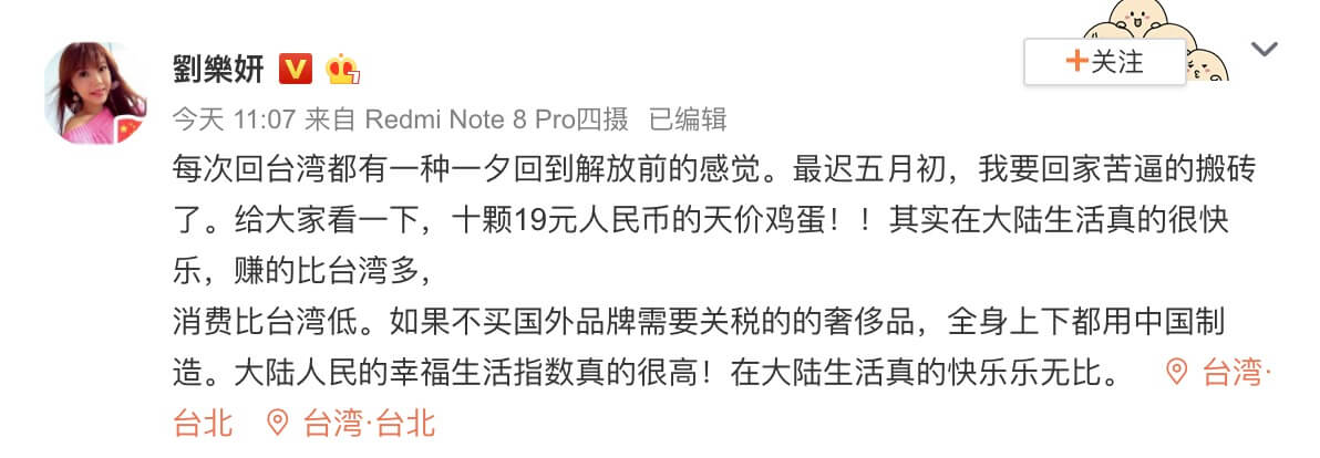 此外,劉樂妍也在微博發文表示,「每次回台灣都有一種一夕回到解放前的感覺」,還說台灣的雞蛋價格是天價,「其實在中國生活真的很快樂,賺得比台灣多,消費比台灣低~不買國外品牌需要關稅的奢侈品,全身上下都用中國貨,大陸人民幸福生活指數真的很高!」讓不少中國網友看了都驚訝的說,「不是說台灣物價低嗎?看來也不便宜」。