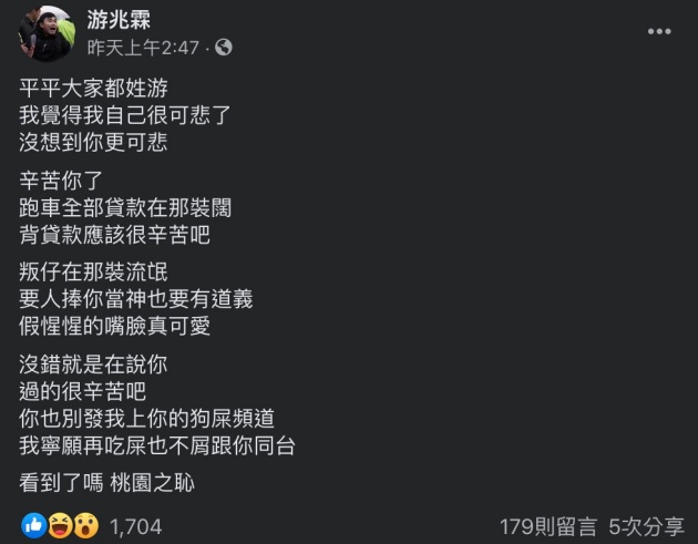 日前吃屎哥在臉書上表示,「平平大家都姓游,我覺得我自己很可悲了,沒想到你更可悲」!同時也指出對方跑車貸款還裝闊氣、假惺惺,更揚言自己寧肯再吃屎,也不屑與對方同台,上對方的狗屎頻道,最後還直呼對方是「桃園之恥」。隨後吃屎哥也在留言區中,曬出對話截圖,證實貼文中吃屎哥所罵的對象就是游否希!