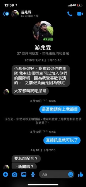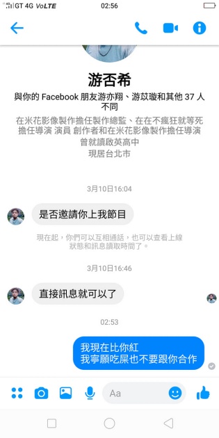而游否希也立刻現身,決定拿出證據來打臉吃屎哥,只見游否希在留言中曬出對話記錄,和吃屎哥的幾乎一樣,不過卻多了一段讓事件反轉的關鍵對話!當時是吃屎哥先私訊游否希,表示很喜歡在不瘋狂團隊,自己也喜歡表演、想紅,希望可以加入團隊,因此游否希才詢問是否能邀請對方上節目,並非主動邀約吃屎歌合作,同時游否希也開酸「我覺得你可以拍影片嗆我~哈哈哈這樣我不用邀請你就有流量了,不然你在多發幾篇,就像你當初跟我談的一樣」。