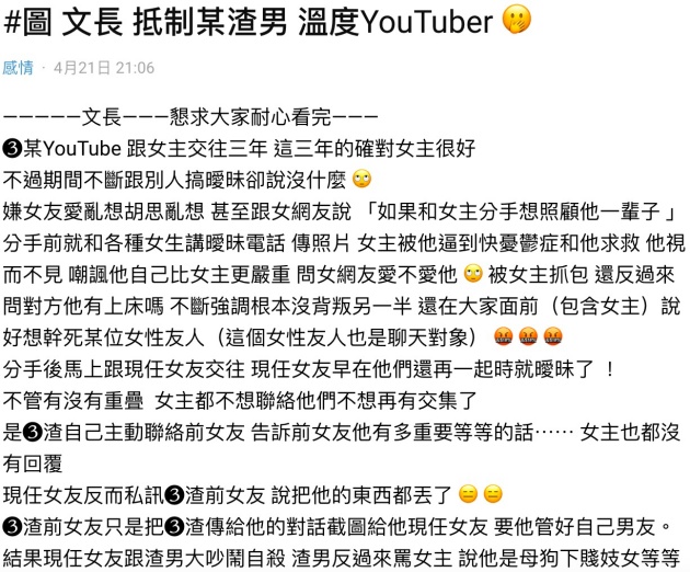 日前有網友在Dcard發文表示,某位三開頭的YouTuber,交往時不斷跟別人曖昧,甚至在正宮面前,直言想和某女性友人上床!最後兩人分手收場,該YouTuber立刻無縫接軌,跟現任女友交往。沒想到該YouTuber又回頭主動聯繫前女友,前女友決定將私訊截圖傳給現任,希望對方能約束好自己的男友。