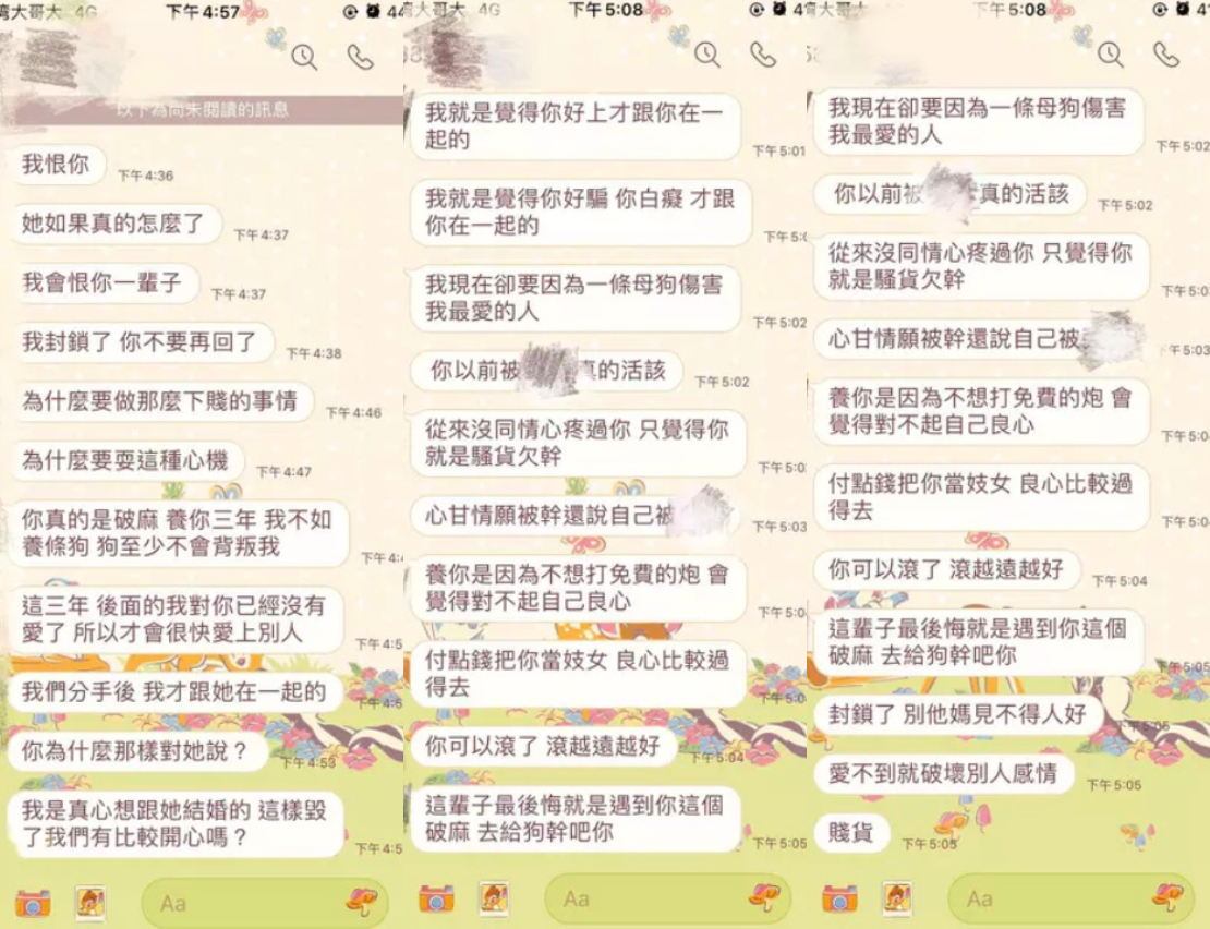 沒想到截圖一傳,現任女友大鬧自殺,Dcard網友指出,該YouTuber竟反過來謾罵前女友,提起「母狗」、「下賤」「妓女」、「欠幹」等十分不堪的字眼,狠心揭開前任傷疤,甚至直呼對前女友好,只是因為不想打免費的砲,難聽言論不斷洗禮前女友,原PO也氣憤表示,「誰主動聯絡誰?她是因為什麼鬧自殺?是因為渣男聯絡女主講那些話這件事,並不是女主做錯什麼好嗎 !心虛到了極點,講話還各種不入流,超噁心」。原PO希望大家能看破假面具,抵制渣男。