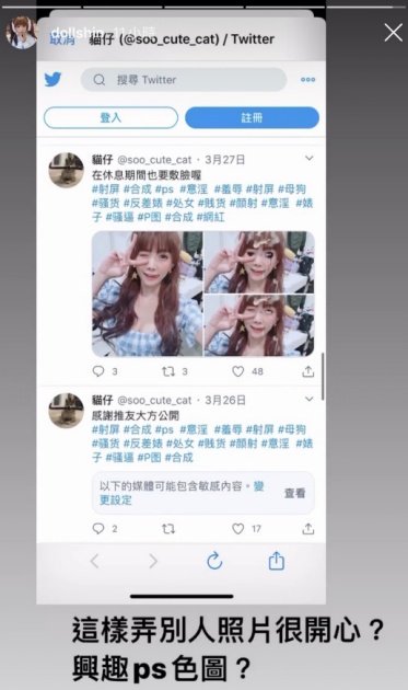 宅男女神「解婕翎」擁有甜美外表與火辣身材,個性大方的她時常不計形象搞笑演出,一路走來累積不少死忠粉絲喜愛。不過日前卻有網友將解婕翎的照片惡意P圖,噁心畫面讓解婕翎決定不忍,曬出帳號公審「弄別人照片很開心」?