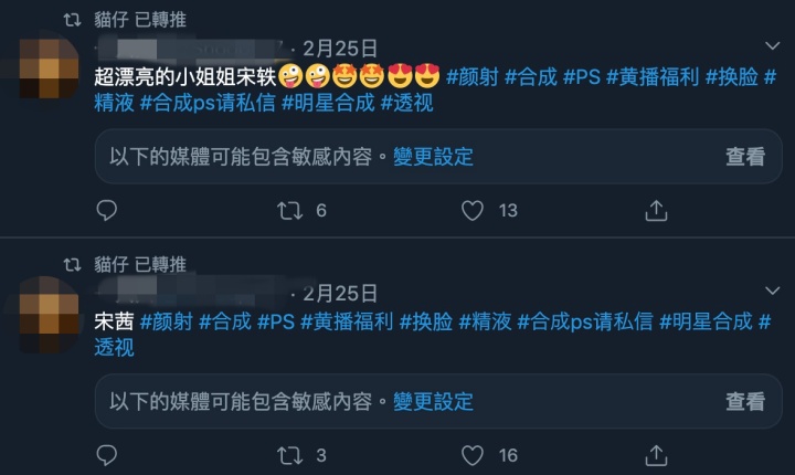 目前該帳號已將上傳的貼文、合成P圖全數刪除,不過從帳號中仍可以發現,他曾轉推過其他P圖帳號的推文,裡面有許多中國女明星P圖,包括「迪麗熱巴」、「宋茜」等人,可見合成淫圖的行為不只一人,而受害明星、網紅更是多到數不清!