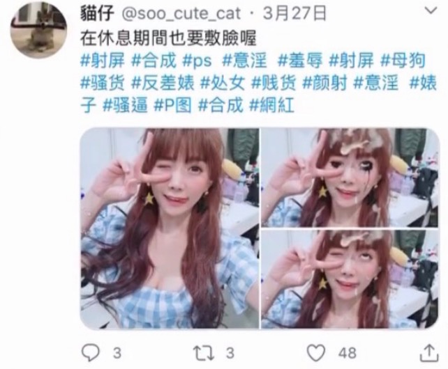 而該網友也在貼文中,標上許多標籤,其中更是包括「羞辱、母狗、騷話、賤貨、婊子」等難堪字眼,雖然是合成圖,但仍造成藝人形象毀損,解婕翎這次公開帳號處理,讓網友十分贊同,盼能抑止這樣的行為繼續發生!