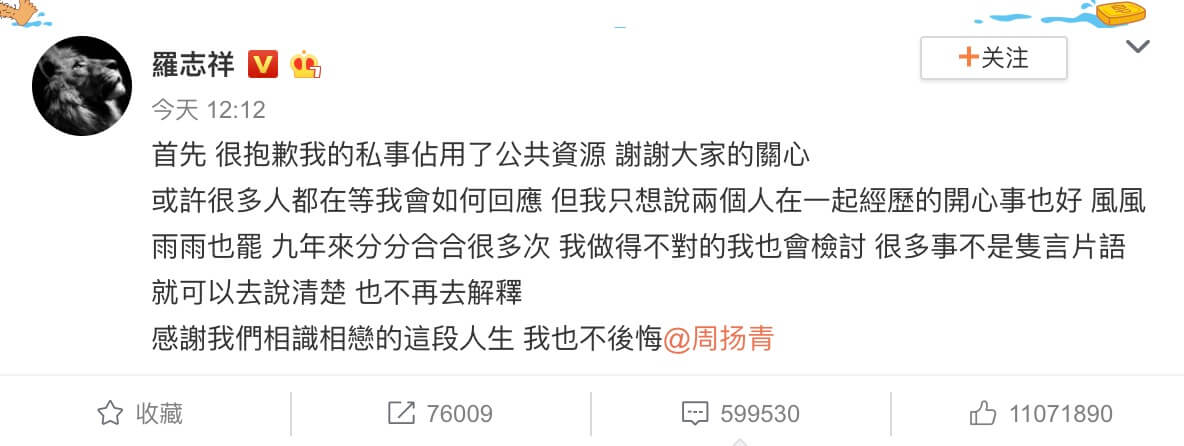 藝人羅志祥交往多年的女友周揚青23日一早就大方在微博發了長文,公開承認兩人確實已經分手的消息,女方非常難過的指控羅志祥都會趁她不在的時候,「約女生來家裡,而且還都是約不同的人!」甚至爆料,羅志祥跟兄弟們「經常舉辦正常人無法想像的『多人運動』」,氣到大罵「你真的是天生渣!」如今也傳出中國網友要求他退出《極限挑戰》與《創造營2020》,若再加上《這就是街舞3》節目與代言等,將會丟了3.6億酬勞!