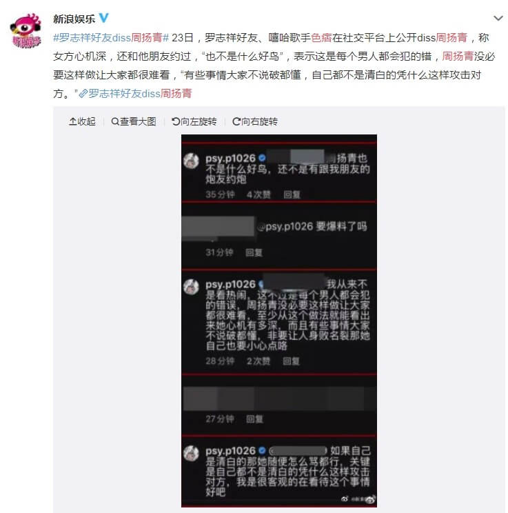 周揚青在微博發文貼出了「原子彈等級」的分手信,在23日引起了熱烈的關注與討論,網友們目前都一面倒力挺周揚青,還不停挖出小豬過往的黑歷史!不料,中國饒舌歌手「色痞」先是到羅志祥貼文底下留言「加油」之後,馬上接著爆料,「周揚青也不是什麼好鳥,還不是有跟我朋友的炮友約炮!」並且強調,「這不過是每個男人都會犯的錯,周揚青沒必要這樣做,讓大家都很難看」。