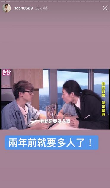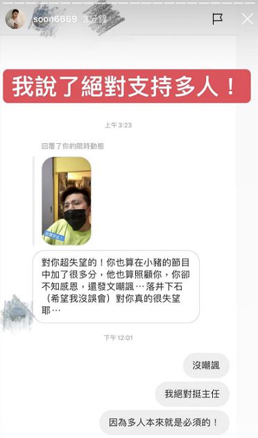 對此,孫生也現身親回私訊表示,自己並沒有在嘲諷,「我絕對挺主任,因為多人本來就是必須的!」最後也在限時動態中貼出這則對話截圖,並再次強調絕對支持多人!同時孫生也在IG曬出多人影片感嘆,一年半前就在多人,引來不少網友回覆表示「到底誰是前輩」、「反骨先知」、「必須要多人混戰!才會爽」。