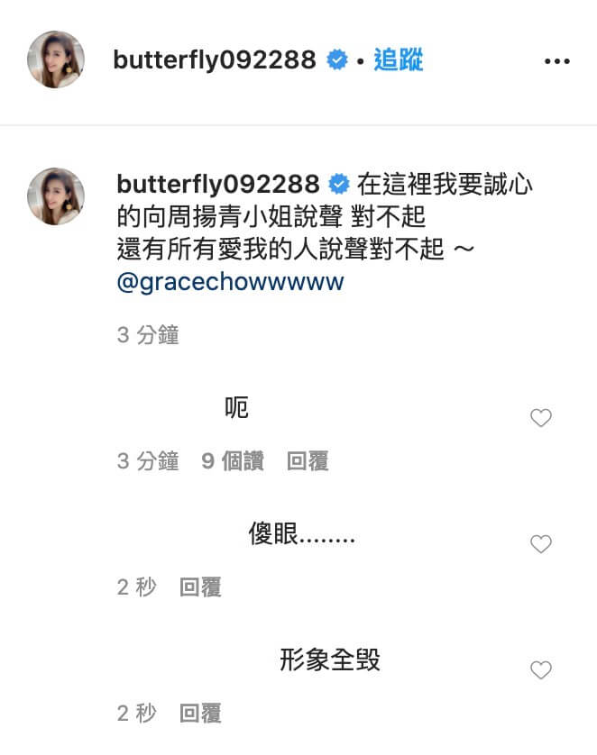 其他網友一看到這則道歉貼文,馬上都紛紛湧入愷樂的社群平台瘋狂留言洗版說,「傻眼啦!」、「乾!童年崩壞了」、「形象整個全毀了耶」、「傻呆萌的蝴蝶姐姐原來也黑掉了」、「看來真的有更多猛料還沒爆」、「希望周揚青可以把該說的話說完」、「不會吧!到底為何這樣」、「不怕!做愛而已,道歉什麼?」、「誰都會犯錯,沒什麼好酸的」、「原來沈默了這麼久,只有兩句話要說...」。