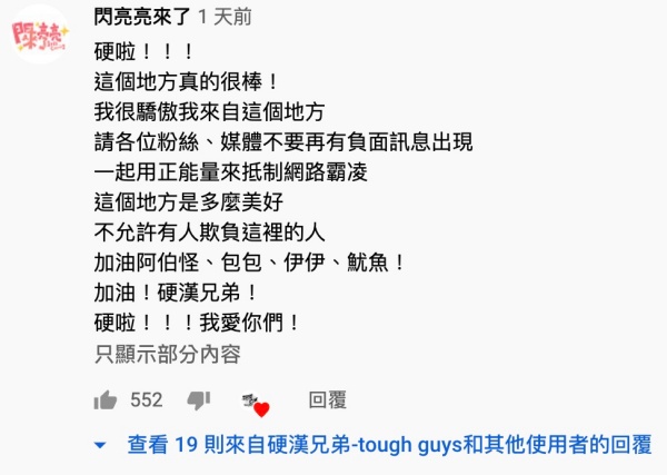 除了深情自白以外,由於黃包包過去曾發生親密片外流、Line被盜用等問題,因此他也在影片當中提醒網友,使用手機通訊軟體等一定要多加小心!影片一出,閃亮亮也立刻現身回覆,「這個地方真的很棒!我很驕傲我來自這個地方!這個地方是多麼美好!不允許有人欺負這裡的人」,最後還留下一句「我愛你們」,可見亮亮即使離開,但仍和硬漢團隊仍十分要好!