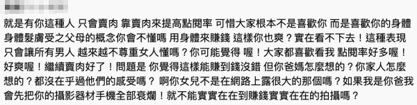 不過性感裝扮,卻也立刻引來批評,網友開罵米砂靠賣肉來賺點閱,直呼這樣的作為,只會讓所有男人越來越不尊重女權,同時也認為米砂沒有想過父母心情、感受,「如果我是你爸我會先把你的攝影器材手機全部摔爛!就不能實實在在的賺錢實實在在的拍攝嗎?」