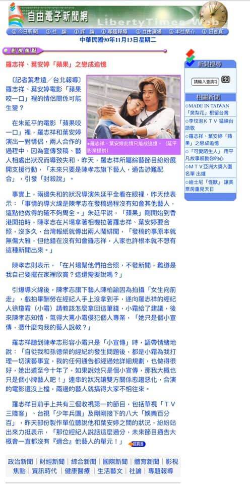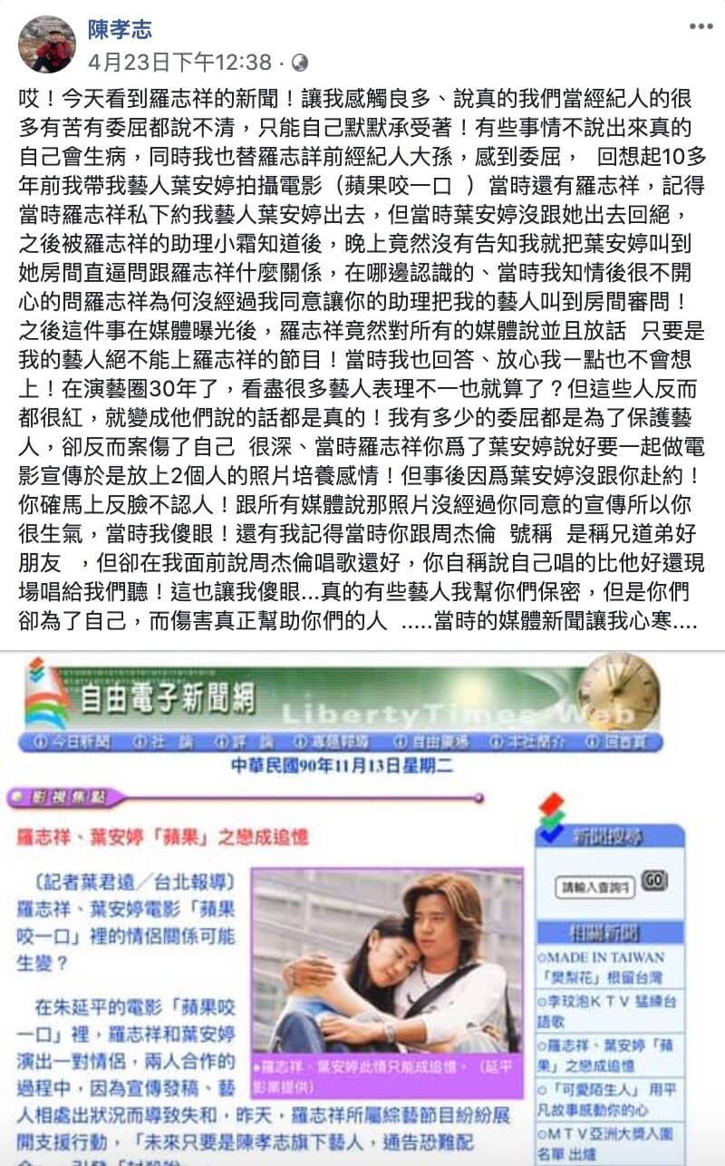 資深經紀人陳孝志最近在臉書發文寫道,「當經紀人的,有很多苦跟委屈都說不清,只能自己默默承受著!」他談到在10多年前,自己帶著藝人葉安婷去拍攝電影《蘋果咬一口》,羅志祥也是參與演出的演員之一,並透露,「當時羅志祥想私下約葉安婷出去,但是被女方拒絕」。