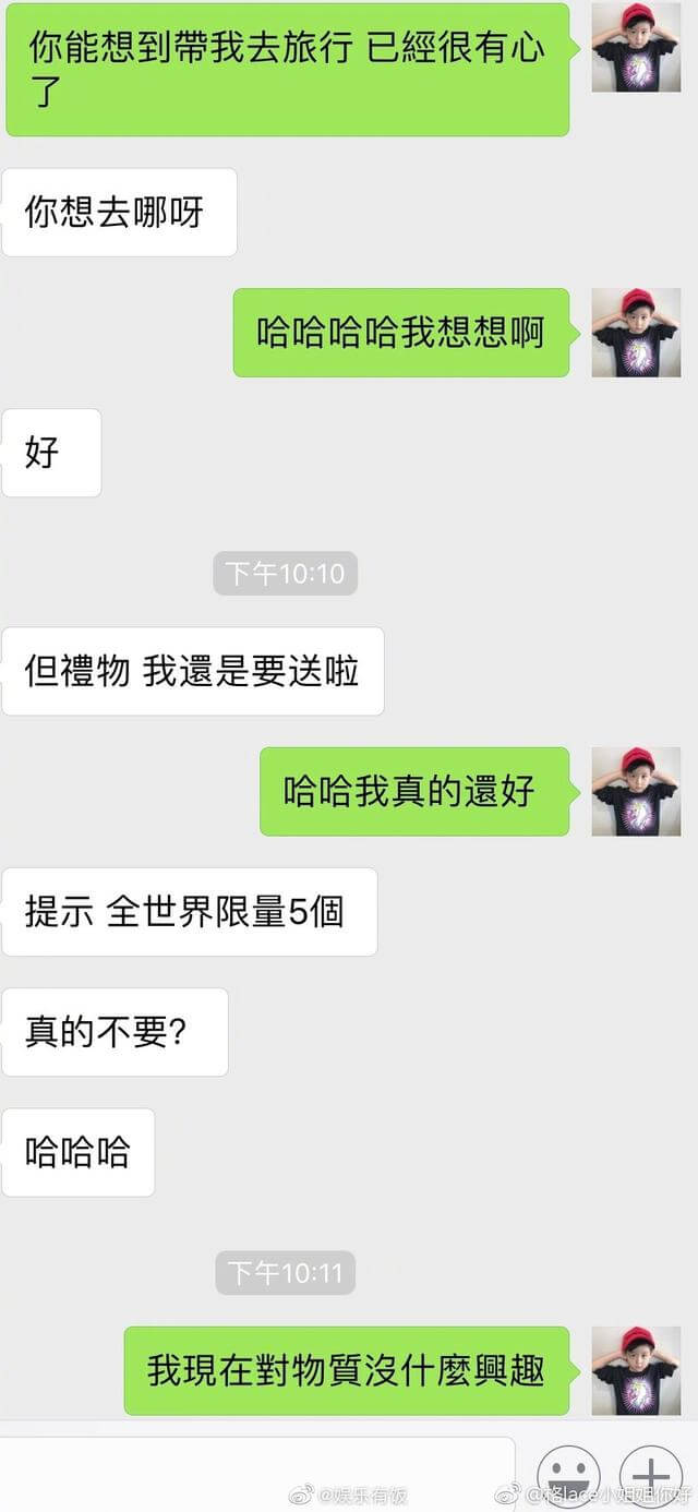 羅志祥還在對話內容中透露他準備了全球限量五個的神秘禮物要給周揚青,不過女生卻回他,「我現在對物質沒什麼興趣!」並對小豬說,「你能想到帶我去旅行,就已經很有心了~」可見比起禮物,周揚青更需要的是小豬的陪伴。