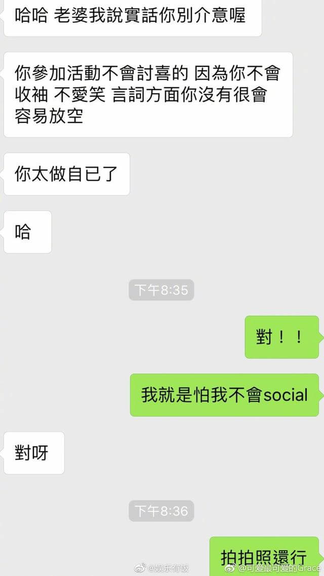 此外,從對話紀錄中可以看到,周揚青跟羅志祥在聊天時,都會以「老婆」、「老公」來稱呼對方,還叫羅媽媽「婆婆」,甚至連收到羅媽媽送給她的馬卡龍,也會在微博發文高喊,「我有全世界最好的婆婆」。而羅志祥也會時不時關心她,說她穿著白色衣服去參加音樂節,擔心濕了會變很透,不小心曝光...也曾跟女友說過她不適合去社交場合,頂多只能拍拍照,之後又拒絕周揚青去參加活動,讓女友覺得很掃興。
