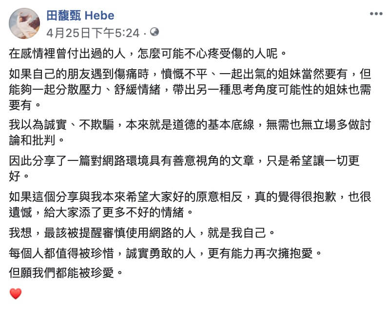 而田馥甄也發文解釋,「在感情裡曾付出過的人,怎麼可能不心疼受傷的人呢?我以為誠實、不欺騙,本來就是道德的基本底線,無需也無立場多做討論和批判,因此分享了一篇對網路環境具有善意視角的文章,只是希望讓一切更好!」沒想到最後竟然換得了網友們的謾罵,讓田馥甄感到非常抱歉地說,「分享這個與我本來希望大家好的原意相反,真的覺得很抱歉,也很遺憾,給大家添了更多不好的情緒!」