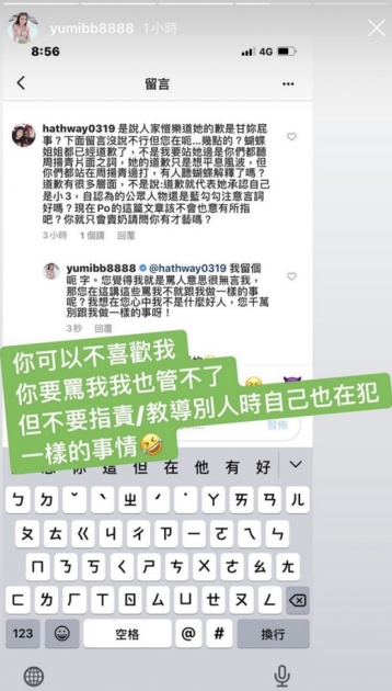 網友的一番話令Yumi立刻回覆,「我留個呃字,您覺得我就是罵人意思我很無言,那您在這講這些罵我的話,不就跟我做一樣的事」?同時Yumi也將這段話截圖,轉發到限時動態呼籲,可以不喜歡,但不要指責、教導別人時自己也犯一樣的錯!