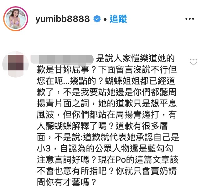 日前辣模Yumi在愷樂道歉貼文底下留言「呃」,沒有過多惡意言詞,卻反被網友出征,「是在呃幾點」?網友留言表示,大家只聽周揚青的片面之詞,卻未曾聽過蝴蝶解釋,或許道歉是為了平息風波,並非承認自己是小三,網友更痛批Yumi自己擁有不少粉絲是個公眾人物,應該注意言詞,「只會賣奶請問你有才藝嗎」?