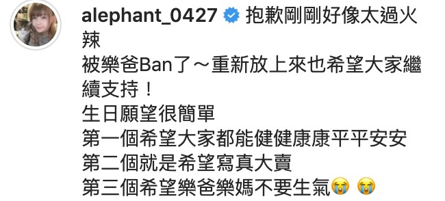 阿樂曬出照片的同時,也在貼文中寫下,這次的生日願望只希望大家能平安健康、寫真集大賣、樂爸樂媽不要生氣!原來是先前另一張宣傳照尺度更火辣,秒被樂爸Ban,勒令下掉!不過阿樂也闡述這次寫真的理念,從一個愛打電動的女孩,慢慢走向主持舞台,一步步朝著夢想前進,期盼能讓大家看到更多元的阿樂,因此才有了這本寫真,拍攝一系列青春自然的瞬間,盼大家會喜歡!