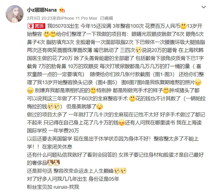 小z娜近幾年在微博上相當火紅,由於她整形後的模樣和前幾年造成超高話題的網紅「蛇精男劉梓晨」有過之而無不及,因此受到相當大的關注,小z娜也曾經在微博分享過自己「動過100次手術」整形史,共花費20萬人民幣(大約台幣86萬),依次是「眼睛光雙眼皮就做了6次、眼角5次鼻子4次,脂肪填充2次、全臉磨骨一次面部吸脂2次」,幾乎把臉上「能削的都削了」。