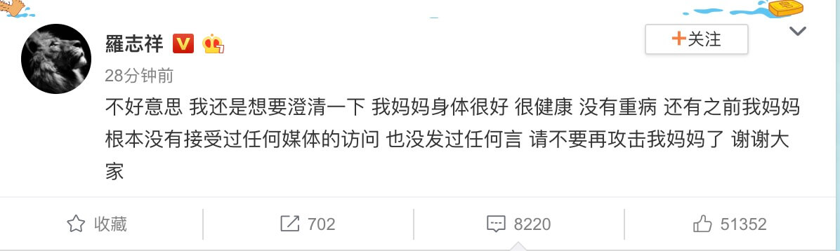 羅志祥在感情風波爆發之後,沉默了數日,終於在29日再度用微博發文寫道,「不好意思 ,我想要澄清一下,我媽媽身體很好、很健康、沒有重病,還有我媽媽根本沒有接受過任何媒體的訪問,也沒發過任何言,請不要再攻擊我媽媽了!謝謝大家」。