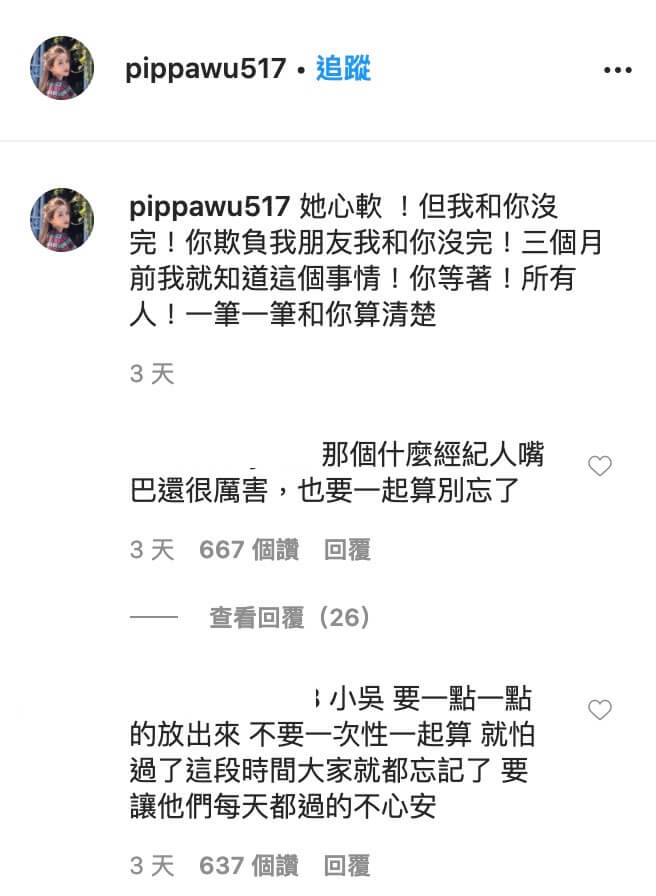 根據《鏡週刊》報導,周揚青的閨蜜Pippawu先前在IG發文嗆聲說,「她心軟!但我跟你沒完!欺負我朋友,我和你沒完!三個月前我就知道這事情!你等著!所有人!一筆一筆和你算清楚!」似乎是正在預告就算周揚青不肯下手,她也絕對不會輕易放過小豬,並透露自己早在三個月前就知道他們分手,表示她知悉分手的內幕與實情,也非常直白的告訴小豬她絕對會一筆一筆算,可以明顯感受到她和其他自稱周揚青閨蜜的人不太一樣。