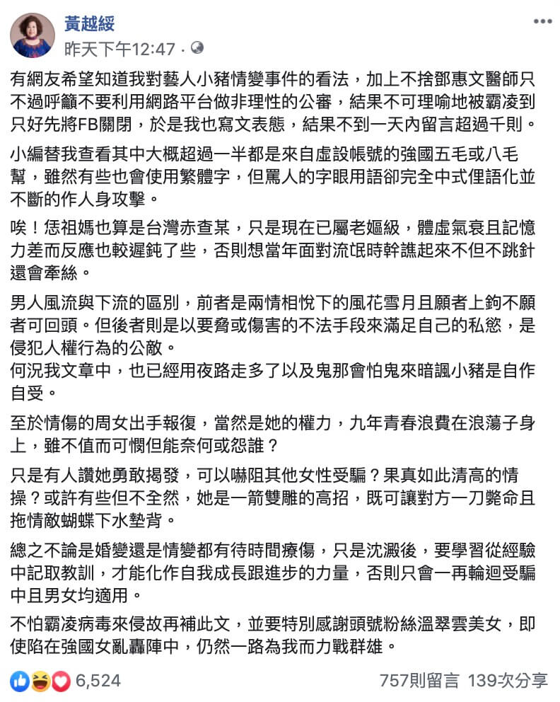 名嘴黃越綏最近在臉書發文寫道,「有網友想知道我對藝人小豬情變的看法,加上不捨鄧惠文醫師只是呼籲不要利用網路平台做非理性的公審,沒想到不可理喻地被霸凌到只好先關閉臉書,於是我也寫文表態,結果不到一天留言超過千則!」