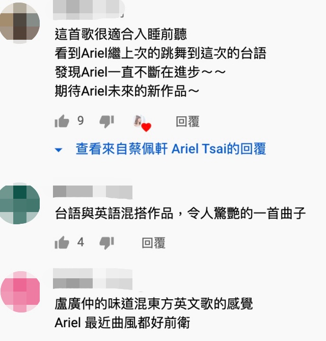 蔡佩軒新曲一發布,立刻引來不少粉絲如癡如醉,紛紛留言表示,「不愧是Ariel的歌,還可以相互呼應」、「英文配台語真是奇妙的組合~」、「這首歌很適合入睡前聽,看到Ariel繼上次的跳舞到這次的台語,發現Ariel一直不斷在進步~」、「盧廣仲的味道混東方英文歌的感覺!Ariel 最近曲風都好前衛」、「英語台語完全結合,呈現完美歌曲~」、「超好聽!團長唱起來就是不一樣」。