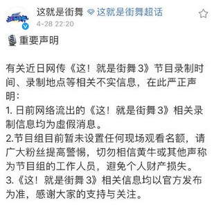 在微博上有消息指出,羅志祥仍然還在《這就是街舞》的導師名單上,將會跟王一博、張藝興等人同台擔任導師,而且節目將會在5月16日開始錄影,不過,節目單位在得知這個資訊傳開來時,急忙在28日發聲明澄清說,「這是不實消息!目前都還沒有決定能進場錄影的名額跟錄影細節」。