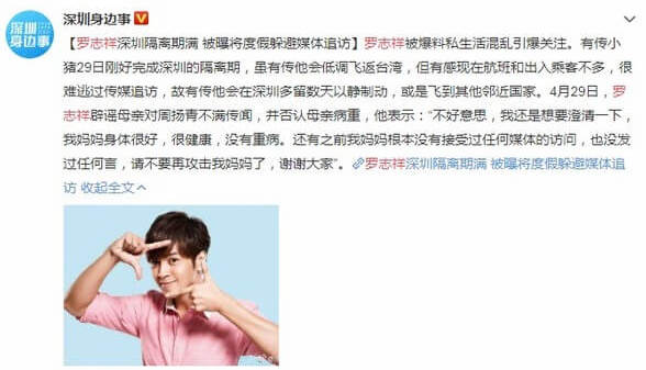 此外,在另一個微博「深圳身邊事」帳號中,則是爆料說「羅志祥原本計畫要低調飛回台灣,但礙於目前航班減少,加上他擔心飛回台灣之後,會瘋狂被媒體追問關於周揚青爆料的事情,便傳出他可能會在深圳多待幾天,或是看情況決定下一步,也可能飛到其他鄰國避避難」。