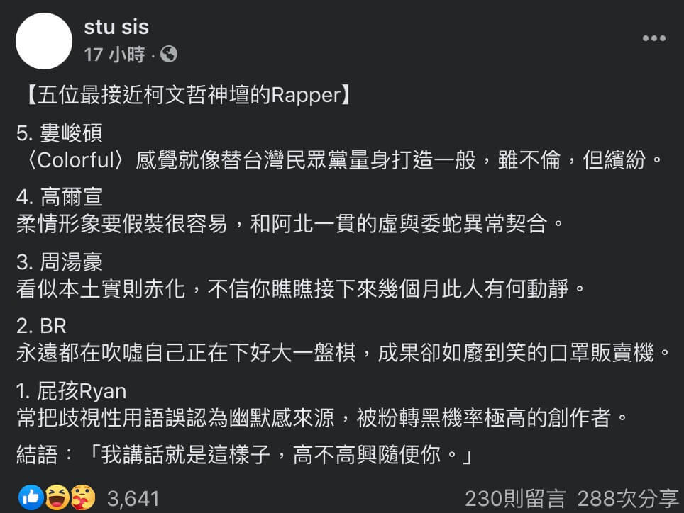 有時常在關注他的人肯定stu sis一直以來對於嘻哈歌手的喜好相當分明,然而在昨日stu sis在粉專上發出一篇名為「五位最接近柯文哲神壇的Rapper」的點評,當中第五名為近期推出新專輯的「婁峻碩」,對此他也寫下相當犀利的評論:「〈Colorful〉感覺就像替台灣民眾黨量身打造一般,雖不倫,但繽紛。」