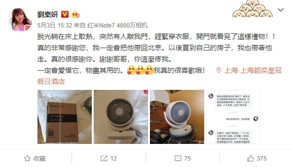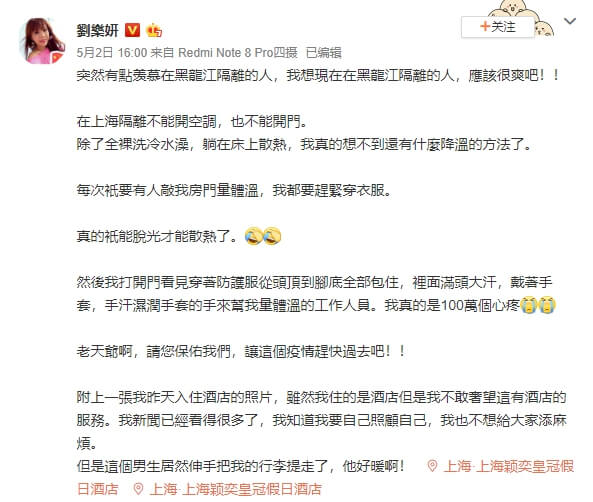 後來劉樂妍又發文說很羨慕在黑龍江隔離的人,因為在上海隔離不能開空調,也不能開門,「除了全裸洗冷水澡,躺在床上散熱,還真的想不到有什麼降溫的方法~只要有人敲房門要量體溫,我都要趕快穿衣服!」還透露自己看到飯店員工穿著防護衣,滿頭大汗的替大家量體溫,整個100萬個心疼!不過後來有人送電風扇到飯店給她,讓她感動不已。