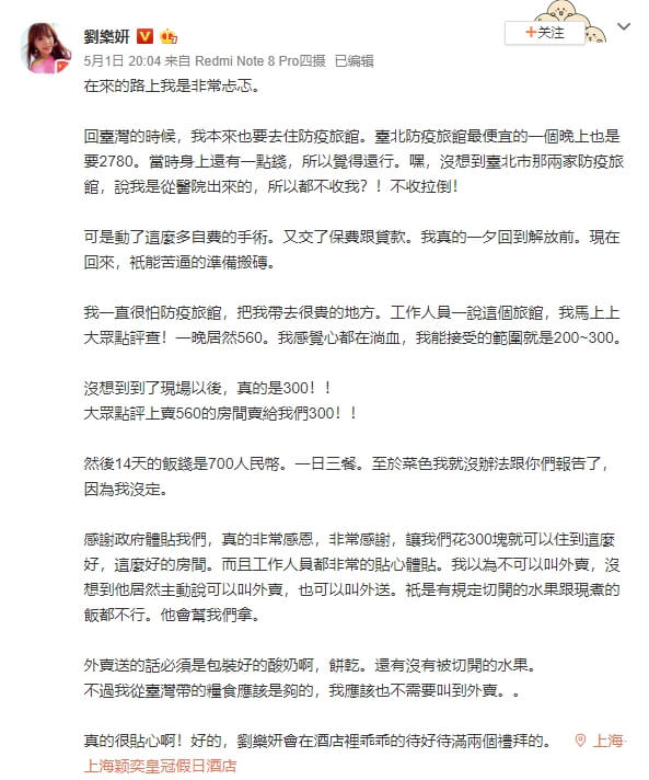 劉樂妍在1日終於搭機飛回中國上海,在機場時看到整個空蕩蕩、沒什麼人,但她依然穿上輕便雨衣當防護衣,還準備一頂安全帽,只是不好意思拿出來戴。她也在微博跟大家分享她抵達上海之後,馬上就跑到防疫旅館去,本來想說在網路上查到旅館的價格是一晚人民幣560元(約新台幣2400元),讓她覺得心在淌血,沒想到一到飯店竟只收她人民幣300元(約新台幣1300元),讓她覺得非常驚訝,竟然能以這麼便宜的價格入住!