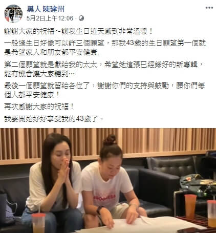 藝人陳建州最近剛慶祝完43歲生日,在生日當天也收到了不少祝福,還有老婆的陪伴,可以說是過得相當幸福~跟先前深陷口罩風波時期的狀態相比,范瑋琪最近也是逐漸回歸社群,而黑人在許下生日願望時,也將其中一個願望獻給了范范,希望老婆在深陷爭議之後,新專輯可以被大家給聽到!