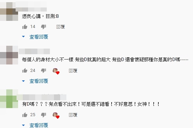 瑀熙照片、影片一同公開,立刻引起許多網友關注,同時也有人紛紛留言表示,「些廠商會有所謂的歡樂杯,就是把原本的罩杯往上多一個」、「瑀C加油,變成瑀D」、「還是報三圍比較準,因為看起來真的沒小D」、「憑良心講,目測只有B」、「每個人的身材大小不一樣,有些D就真的超大,有些D還會懷疑那種你是真的D嗎」。