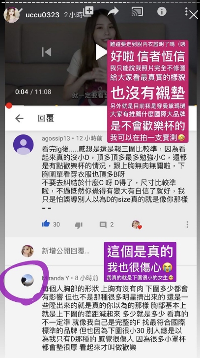 面對網友們的回覆,瑀熙也感到些許傷心,直呼「難道要走到脫內衣證明了嗎?」不過隨後她也表示,信者恆信,照片完全沒有修圖,只呈現最真實的樣貌給大家,若網友們有推薦「不會歡樂杯」的內衣,也很願意再拍一支實測影片!雖然質疑聲浪四起,不過仍有粉絲鼓勵,認為瑀熙有自信即可,不用太在意英文數字。
