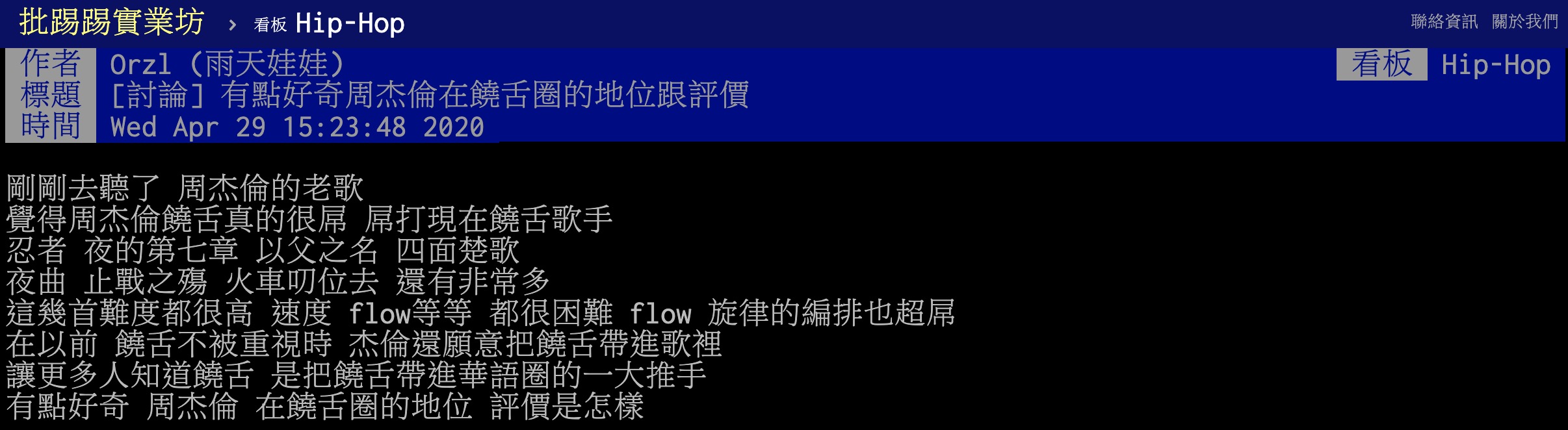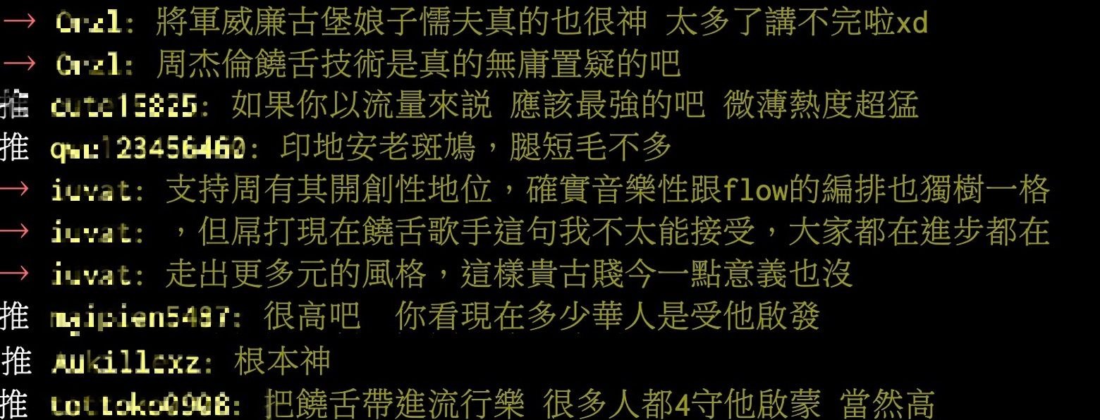 近期有鄉民在PTT嘻哈板中再度問卦關於周杰倫的饒舌實力,原PO列舉出許多周杰倫早期的作品,並寫下:「這幾首難度都很高、速度、flow等等都很困難,flow、旋律的編排也超屌,在以前饒舌不被重視時,杰倫還願意把饒舌帶進歌裡,讓更多人知道饒舌,是把饒舌帶進華語圈的一大推手」,並在文末詢問大家周杰倫在饒舌圈的評價為何,也引起許多網友前來討論。